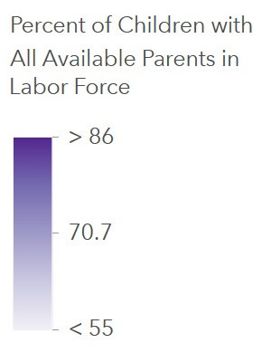 Colored backgrounds. The maps are set to U.S. Census Bureau data that shows children in families where all parents are working. The darker the shade of purple, the greater the percentage of children in working families. This is referred to as a working families layer.
