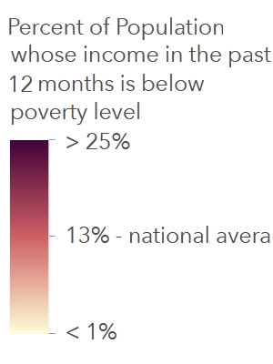- Poverty levels are reflected with various shades of red (the darkest red indicating highest poverty).