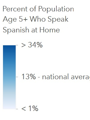 - Homes with children where Spanish is spoken in the home are reflect in blue (the darkest blue has the greatest percentage of Spanish speaking homes).