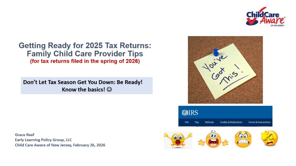 On February 26, 2026 Child Care Aware of New Jersey held a tax preparation webinar going over basic concepts, business expenses, shared expenses, IRS forms, and worksheets and templates to help FCC providers. If you missed the session, you can watch the recorded video here. The slide presentation is also available in English and Spanish.